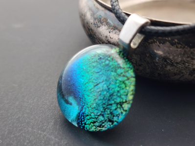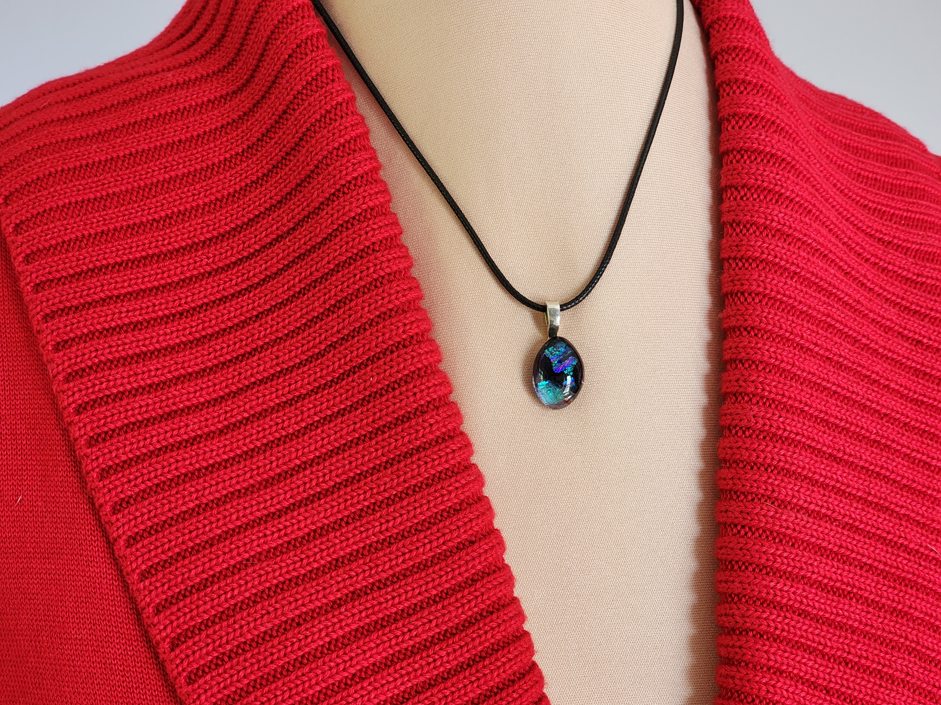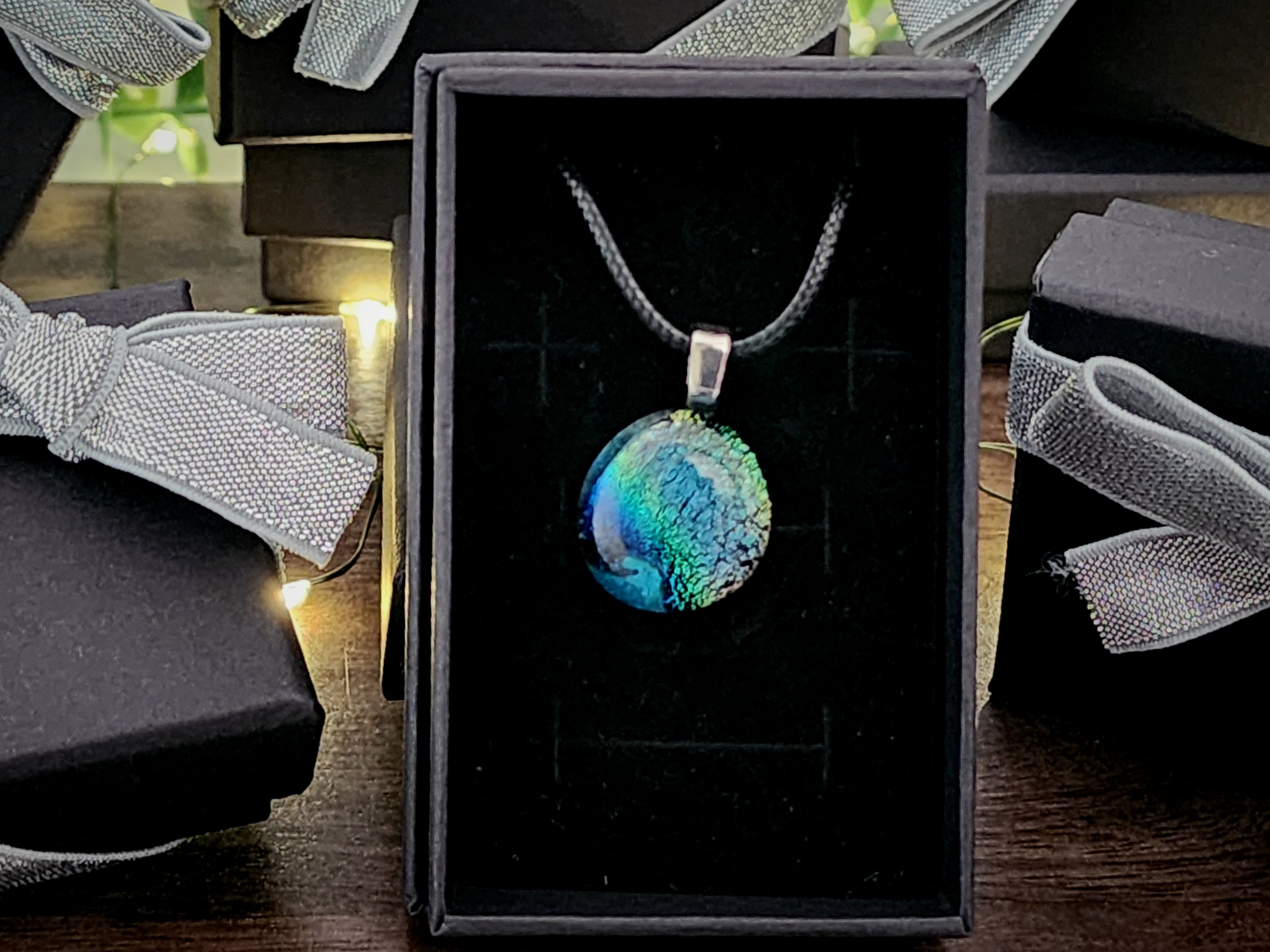 This fused glass pendant is handmade in my studio using upcycled glass in beautiful mixed blue dichroic glass, strung on a durable waxed cord for everyday wear. TCAG pendants are thoughtful and unique gifts for all your gift-giving needs: Grandma, Favorite Teachers, Coworkers and more. I've made it even easier for you by including a gift tag, bow, and jewelry box.