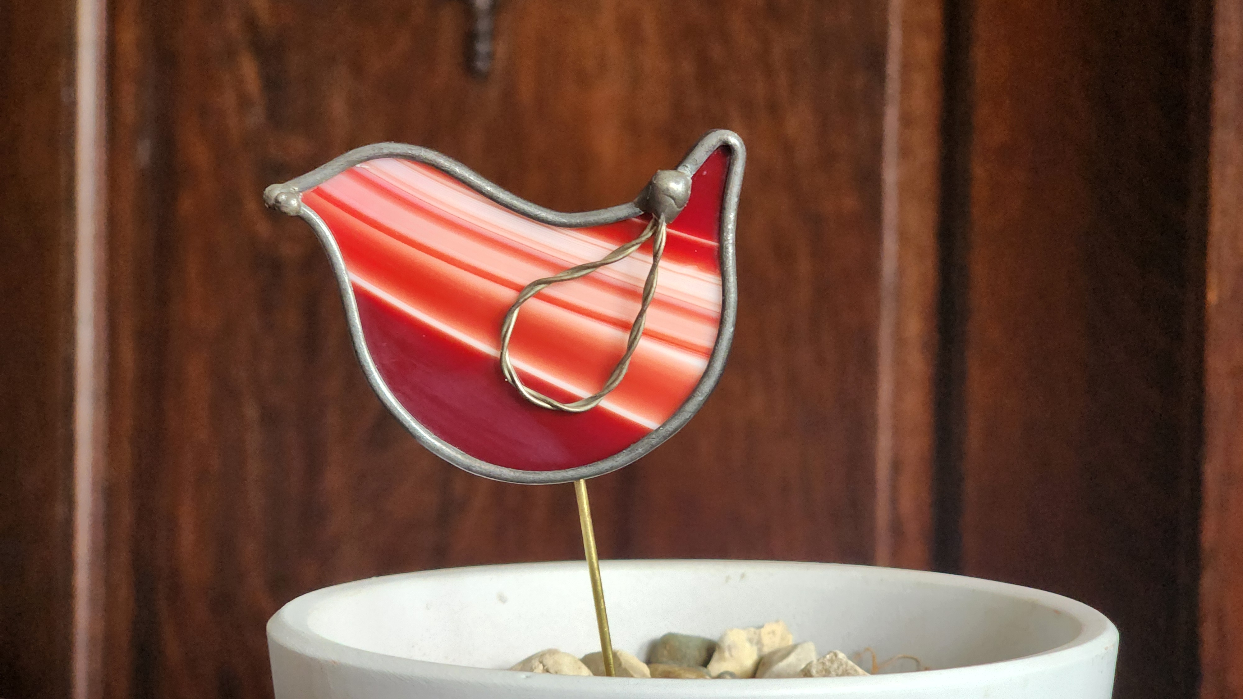 Made of beautiful red and white art glass and hand-twisted wire, this simple yet classic plant stake adds a soft accent to your Christmas, Valentine's, Mother's Day, or everyday, bouquets. When the flowers fade, simply move it to any indoor planter for a touch of timeless beauty. Perfect for those plants that only bloom occasionally... we’re looking at you, Orchids and Christmas Cactus!
